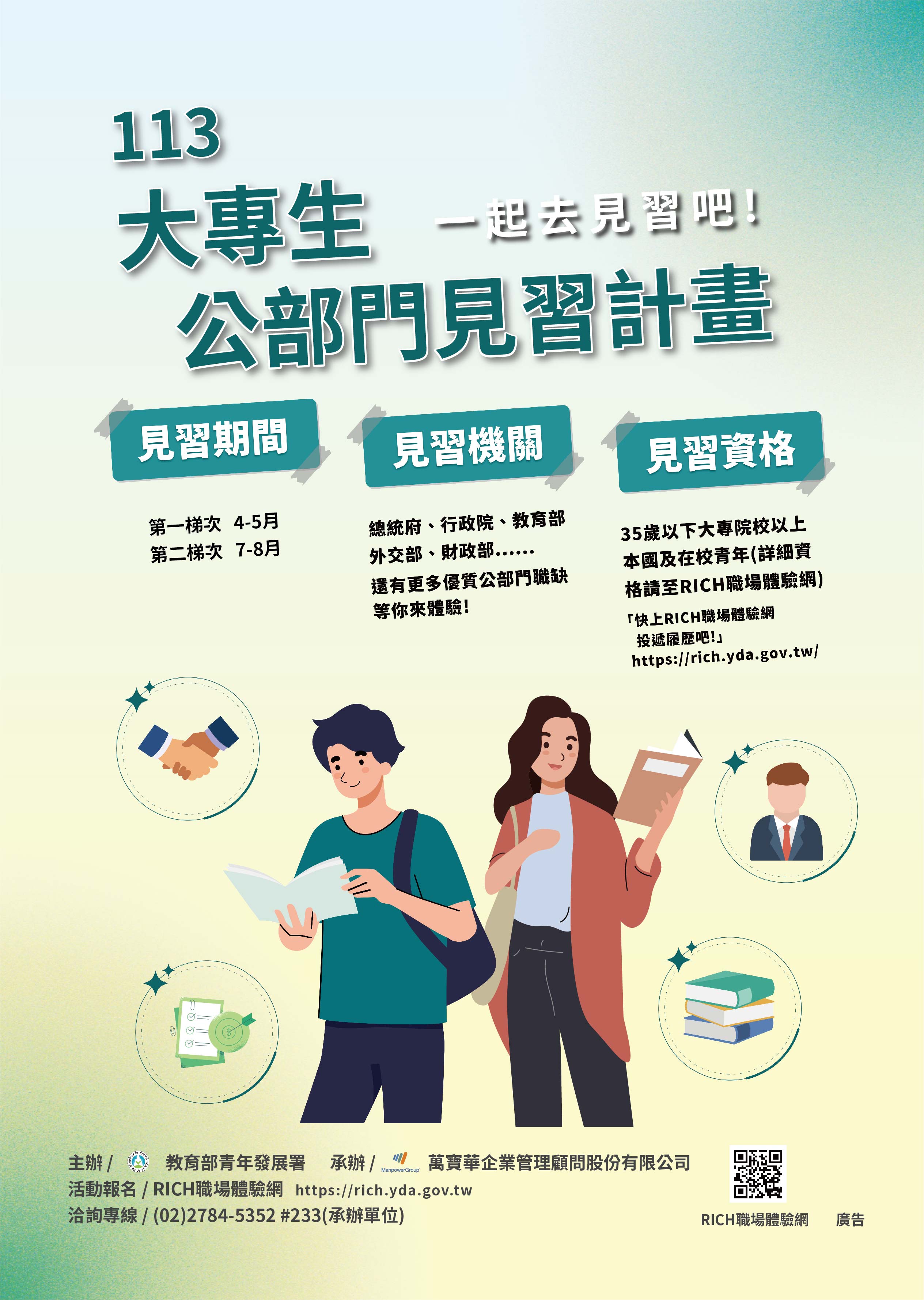 113年大專生公部門見習計畫說明會北商場次訂於4/25(四)